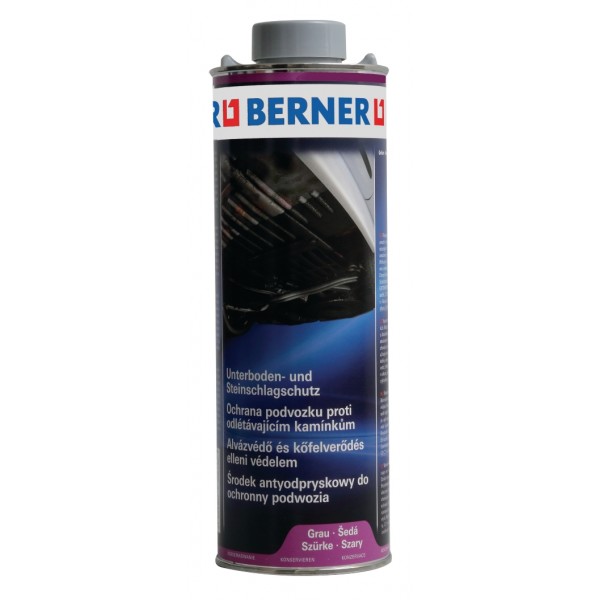 Berner alvázvédő ütésálló, szürke, 1 literes szórópisztolyra csavarható flakonban. A Berner UBS 2000 kőfelverődés védő és alvázvédő gépkocsi-fenéklemezek, sárvédők, kerékdobok, mellső és hátsó köténylemez stb. tartós réteggel való ellátására.